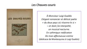 Gualdo participe à l’onéreuse souscription pour l’édition de luxe du premier livre de Montesquiou Les Chauves-Souris, et reçoit un précieux exemplaire orné d’une somptueuse dédicace : « À Monsieur Luigi Gualdo / Elégant romancier et délicat poète du doux pays où résonne le sì’ – et dont j’ai interprété, un musical nocturne. En rythmique ratification De mon affectueuse estime ». Gualdo répond en composant une ode.