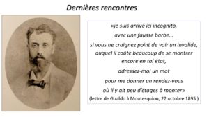 Après un séjour de cure dans le Midi, Gualdo rentre à Paris le 22 octobre 1895 et écrit à Montesquiou une touchante lettre : « je suis arrivé ici incognito, avec une fausse barbe… si vous ne craignez point de voir un invalide, auquel il coûte beaucoup de se montrer encore en tel état, adressez-moi un mot pour me donner un rendez-vous où il y ait peu d’étages à monter », car désormais il marche appuyé sur deux cannes.