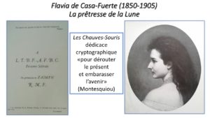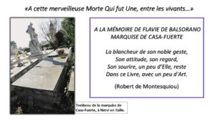 Flavia de Casa-Fuerte vivra désormais seule dans les vers de l’ami-poète. Dans l’édition définitive des Chauves-souris, aux lettres sibyllines de la première édition le comte substitue une dédicace claire : « À la mémoire de Flavie de Balsorano, Marquise de Casa Fuerte, À cette merveilleuse morte / Qui fut Une entre les vivants…/ La blancheur de son noble geste, / Son attitude, son regard, / Son sourire, un peu d’Elle reste / Dans ce Livre, avec un peu d’Art. »