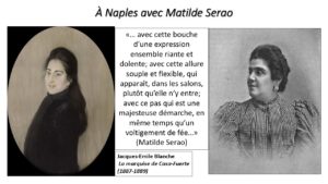 Durant son séjour à Naples en décembre 1900, Flavia rencontre son amie romancière Matilde Serao et la persuade de consacrer un article aux œuvres poétiques de Montesquiou. L’hommage sortira dans Il Mattino du 14 janvier 1901. Flavia, enthousiaste, s’empresse d’envoyer à l’intéressé « ces lignes vibrantes lues par l’Italie entière ». À l’instant Robert demande à la marquise une traduction française de l’article. Pour consolider leur relation, Montesquiou envoie à Matilde Serao, « Femme de Cœur et de Génie », ses dernières œuvres : Les Paons, Autels privilégiés et un article sur le peintre Boldini, paru dans la revue Les Modes. Matilde répond en chargeant Yturri, de passage à Naples, de porter au comte son dernier roman traduit en français, La Vie en détresse, avec cette dédicace : Au comte Robert de Montesquiou. Ô poète, seul l’idéal est réel.