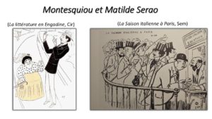 Pendant quelques années, la romancière napolitaine rencontre le poète lors de ses vacances d’été à Saint-Moritz, où se retrouve la crème de l’aristocratie européenne avec des écrivains, des artistes, des élites venues de partout. Le caricaturiste Cir dépeint un Montesquiou élancé discutant passionnément avec Matilde Serao sur une route de montagne en Haute-Engadine, tandis que Sem les croque faisant la queue pour les billets de la « Saison italienne à Paris ».