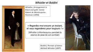 Dans une lettre que Montesquiou adresse au peintre Boldini en novembre 1890, il est question d’un portrait de Whistler exécuté par l’artiste ferrarais et envoyé au comte. « Monsieur, Vous me donnez Whistler par Boldini. Je crois difficile de loger plus de choses en trois mots. Il est vrai qu’il y en a deux grands. Le nom du destinataire s’enorgueillit de faire trinité dans cette trilogie… »