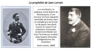 Dès 1890, un observateur mordant et malicieux de la vie sociale, le raffiné esthète Jean Lorrain, avait prophétisé, et en quelque sorte suggéré, leur heureux mariage artistique. Dans le Salon de cette année-là le chroniqueur, après avoir passé en revue quelques tableaux exposés par le peintre ferrarais, note parmi les visiteurs « un vrai Boldini, le poétique comte Robert de Montesquiou, d’une minceur et d’une exquisité inimitable de formes dans un complet gris de brume ou de papier brouillard, nuance et coupe d’une prétention charmante : évidemment Boldini est bien l’homme qui rendrait cette fuyante silhouette d’élégantissime des Esseintes. »