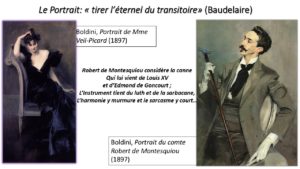 Selon un précepte esthétique cher à Baudelaire, que Montesquiou épouse pleinement, l’artiste doit « dégager de la mode ce qu’elle peut contenir de poétique dans l’historique, de tirer l’éternel du transitoire », car chaque époque a sa propre toilette, ses héros, ses nymphes et ses divinités. Dans son œuvre, le peintre ferrarais s’est montré fidèle au comte Robert, selon lequel la mission du portraitiste est de « proroger à travers les âges, cette ‘lumière de l’âme’, cette ‘aumône inconsciente’ que fut leur beauté. »