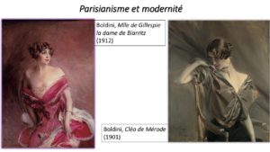 En janvier 1901, Montesquiou aura l’occasion de rendre le petit morceau d’éternité qui lui était offert par le portrait de Boldini, en consacrant au maître, dans la revue Les Modes, un article intitulé « Les peintres de la Femme. Boldini ». Il est compté parmi ces artistes fascinés par l’Éternel Féminin, lequel dans son cas « pourrait s’appeler l’Universel Féminin : la Parisienne ! » Charnelle, élégante, séduisante, la femme-fleur boldinienne est un mélange vertigineux entre peau et tissu. Son œuvre oscille d’après Montesquiou comme un pendule entre parisianisme et modernité.