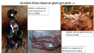Montesquiou a été ravi par un autre tableau de Boldini, le portrait de leur amie commune Marquise Casati qu’il considérait comme « son chef-d’œuvre, si, avec ce Maître, l’on n’avait toujours l’embarras du choix. » Le comte voit dans la Casati boldinienne une chasseuse d’hommes moderne : « la Diane d’une chasse en gants gris perle ; ses lévriers sont devenus des sloughis ; le vert platane s’est transformé en un chapeau à plumes, bien plus grand que l’arbre, et les verts coudriers se sont changés en violettes de Parme. » Inspirés par Montesquiou, on se souvient encore de deux autres tableaux de Boldini : un ibis rutilant dans le Palais rose au Vésinet, daté de 1910, et la vasque dite de la Montespan, relique en marbre rose appartenant à la favorite de Louis XIV et découverte par Yturri.
