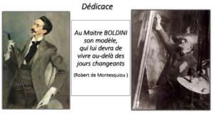 Boldini est désormais compté par Montesquiou parmi les artistes élus chargés de « rajeunir l’extase des regards, renouveler l’appétit des sens » avec leurs œuvres. Par ailleurs, le comte démontre qu’il connaît l’évolution stylistique du maître ferrarais, depuis le temps où il était « exclusivement voué à des tableaux de genre, avec personnages menus et déguisés à l’Empire », jusqu’à « ces grandes figures si verveusement parisiennes. »