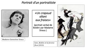 « Voici un mot extraordinaire. Je l’attribue à Madame Straus dont il porte assez la marque verbum pingens [le mot pittoresque], concision, férocité. C’est le portrait verbal, cette description imagée du physique de Boldini « Un crapaud allant aux fraises. »