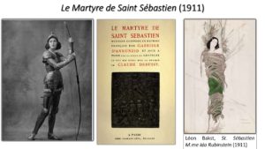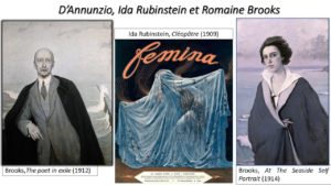 C’est à ce moment-là qu’entre en scène une étoile venue de l’Orient, apparue sur le ciel parisien avec la caravane des Ballets russes, Ida Rubinstein, qui avait bouleversé Montesquiou l’année précédente. Robert transmet sa ferveur à Gabriele D’Annunzio, qui ignorait même le nom de la danseuse. Le Vate se précipite à l’Opéra où on programme une réplique de Cléopâtre. Au retour, le poète ne peut contenir son enthousiasme et écrit tout de suite une dépêche au comte : « Je viens de voir Cléopâtre, je ne domine pas mon trouble, que faire ? » Robert est péremptoire : il faut composer une œuvre capable d’exalter les talents uniques de Ida Rubinstein, dont l’interprétation mettra à son tour en valeur le génie visionnaire de l’auteur. « Telle fut l’origine du Mystère de Saint-Sébastien », écrira Montesquiou dans ses mémoires, fier d’avoir donné le baptême à cet accouplement divin. Le pacte artistique est scellé un jour de printemps au Palais rose, sont présents : Montesquiou, Ida Rubinstein, D’Annunzio et la peintre américaine Romaine Brooks.