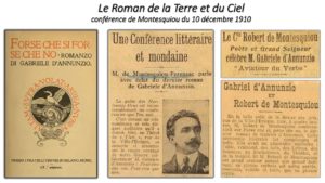 Non content d’avoir suggéré Rubinstein comme interprète et Debussy pour la musique de Saint Sébastien, Montesquiou organise une conférence sur le roman de D’Annunzio Forse che sì, forse che no, juste traduit en français. Dans son discours il retrace la trame du Roman de la terre et du ciel, suivant les évolutions de l’auteur dans le ciel de l’art, et avec une brillante trouvaille il l’appelle « un aviateur du verbe ». Le comte rêve le « ciel viril de l’amitié » qui lie les deux pilotes , « faite de deux statures égales, de deux puissances pareilles, de deux libertés et de deux fidélités indomptables. » En tant que poète, Montesquiou met en évidence les ciselures, les gemmes disséminées le long du livre, isole les fils d’une étoffe merveilleuse. Bien que, comme le remarque le comte, il soit vain de disséquer un rouge-gorge dans l’espoir de découvrir, dans son cœur ou dans sa gorge, le secret de son chant.