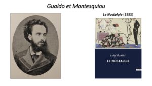 Au printemps de 1883, Gualdo remercie Montesquiou pour l’envoi des « vers sur le vélin volant, exquis, d’une forme et d’une musique parfaites ; j’en suis obsédé et les répète constamment. » L’ami italien rend la gentillesse en envoyant son nouveau volume en vers, Le Nostalgie. Montesquiou en choisira un poème, Alla Sera, pour se lancer dans une « littéraire, littérale, délicieuse et baudelairienne traduction » – c’est Gualdo qui souligne – et l’enverra à son ami. Mais le comte commet une faute en traduisant le mot sventura par « aventure ». L’extrême politesse de Gualdo transforme l’étourderie de l’ami en une licence poétique qui améliore la musicalité de la lyrique : « que vous avez raison de vous tromper ! et combien je préfère au mien le vers : Cesser la joie et céder l’aventure » lui écrit-il. Montesquiou insérera la traduction dans son premier recueil poétique, Les Chauves-souris, avec un nouveau titre, Chiaroscuro.