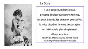 La préface de D’Annunzio est un élégant bas-relief ciselé par la main habile du poète, dont le modèle peut à juste titre se vanter. L’étude de Montesquiou, on y lit, est d’abord un « livre musical », consacré à une beauté défunte, mais prise dans son plus grand éclat et donc rendue immortelle. Avec La Divine Comtesse l’auteur a inventé un nouveau mythe, tout moderne, centré sur le mystère ineffable de la beauté, qui est à la fois une tyrannie et un joug.